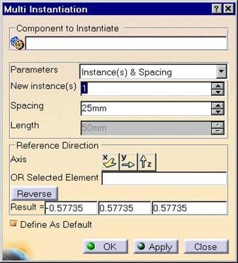 CATIA creates multiple instances of a component based on parameters you specify in the Multi-Instantiation dialog. However, you access the dialog only through the Define Multi Instantiation function. Define Multi Instantiation