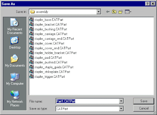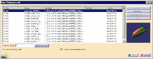 Save Management allows you to see which files CATIA will save, and where CATIA will save the files. The function also lets you override CATIA's default of automatically saving related documents. - Actions you assign to files (Save, Save As, or Save Auto) don't actually occur until you click OK. Changes are not made to the files when you click Cancel.