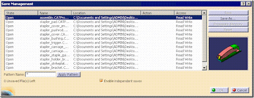 Save Management allows you to see which files CATIA will save, and where CATIA will save the files. The function also lets you override CATIA's default of automatically saving related documents. - Actions you assign to files (Save, Save As, or Save Auto) don't actually occur until you click OK. Changes are not made to the files when you click Cancel.